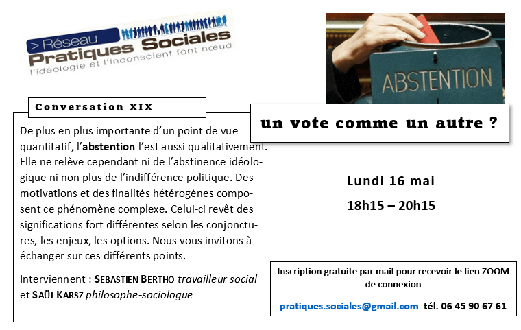 Informations et inscriptions sur le site Pratiques Sociales à la rubrique Contact, par mail à pratiques.sociales@gmail.com ou par téléphone au 06.45.90.67.61