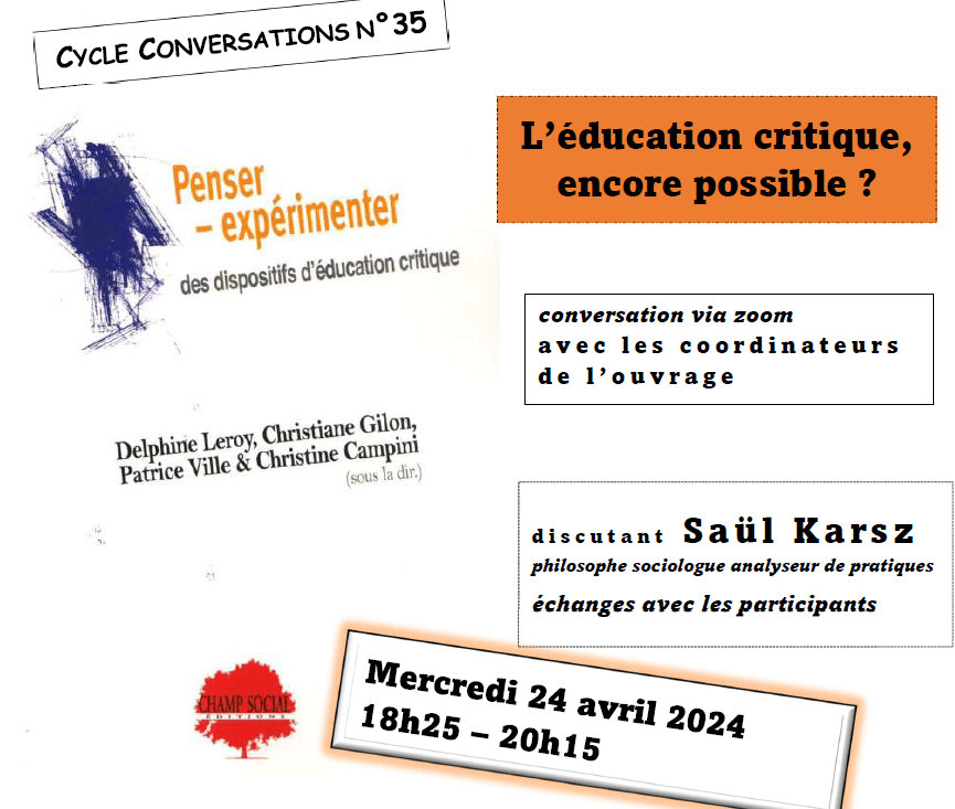 Conversation XXXV – le mercredi 24 avril 2024 de 18h25 à 20h15 : « L’éducation critique, encore possible ? » avec Christiane Gilon, Delphine Leroy, Patrice Ville et Christine Campini (auteurs de Penser-expérimenter, des dispositifs d’éducation critique). Voir l’annonce